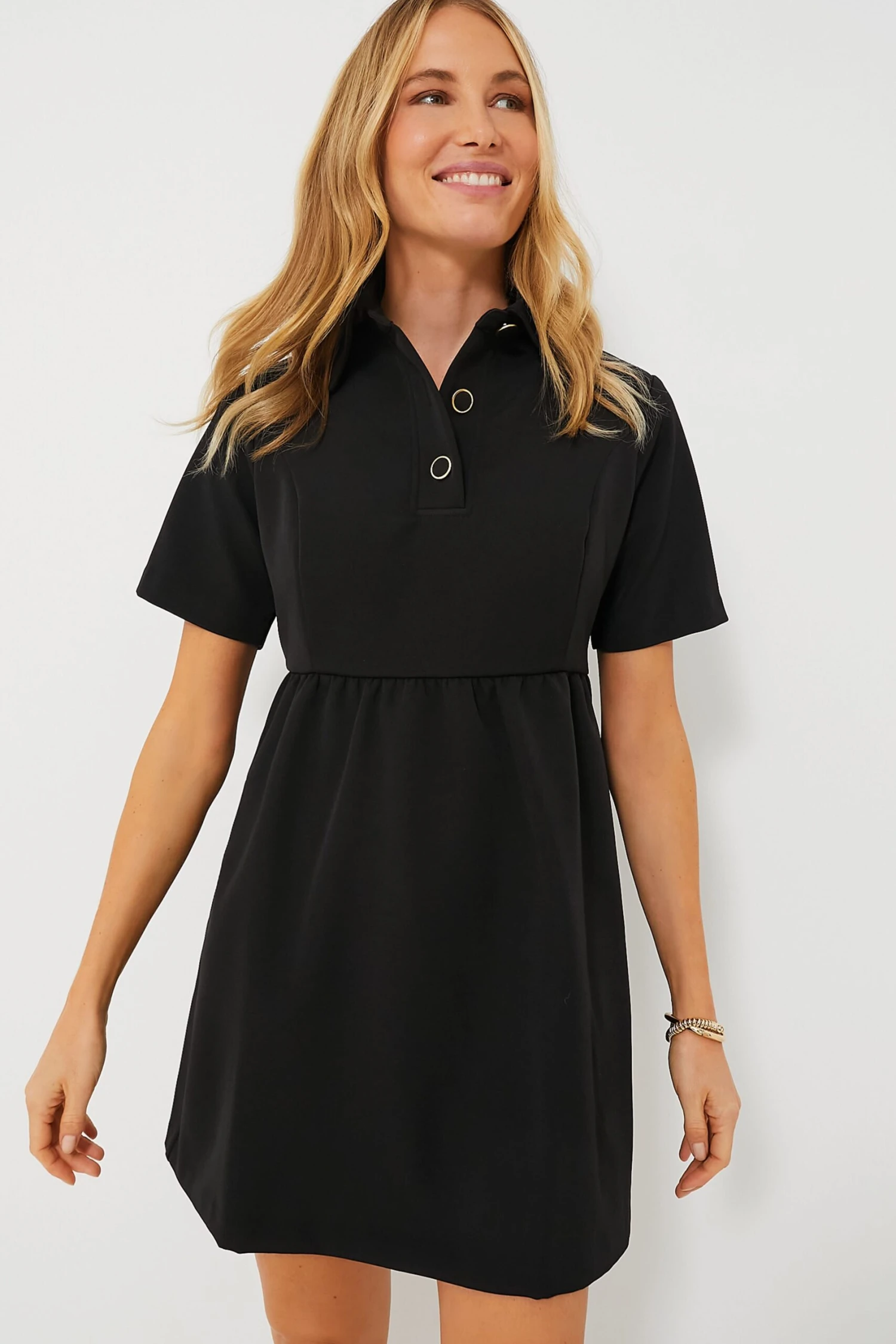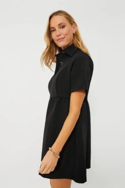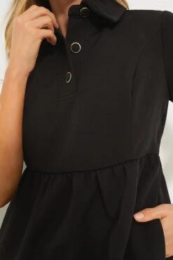 Structured simplicity with timeless details, the Black Arnelle Dress is your next everywhere piece. From the spread collar to the front placket with dramatic buttons, this simple yet striking mini is a closet staple. Throw over a jacket and boots for a day at the office or style it with gold jewelry and heels for an effortlessly chic date night look.Â