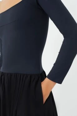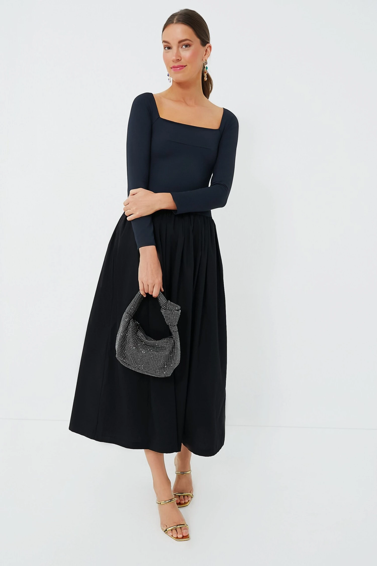 Everyone loves an LBD, and the Black Deeda Dress has all that elegance and charm in a longer silhouette. Featuring a gorgeous square neckline that is perfect for pairing with statement necklaces, a stretchy jersey bodice, and a full pleated skirt with plenty of swishy movement, this piece exudes subtle sophistication that cannot be beat. Perfect for the office, dinner parties, and elevated weekend wear, we are styling this midi with heels and plenty of jewelry for an ensemble that embodies quiet luxury.Â