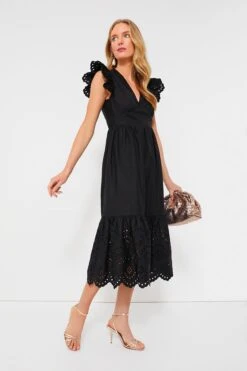 Look lovely as ever in the Black Eyelet Marshall Midi Dress. V-neckline, flutter sleeves and empire waist add femme and flirty flair while the smocking detail under arm provides that perfect fit. The ruffled hem and full skirt brings flowy movement that we can’t get enough of. Effortlessly easy to style, throw on sandals and sunnies for an easy daytime look or dress up with heels and statement earrings for more formal affairs.