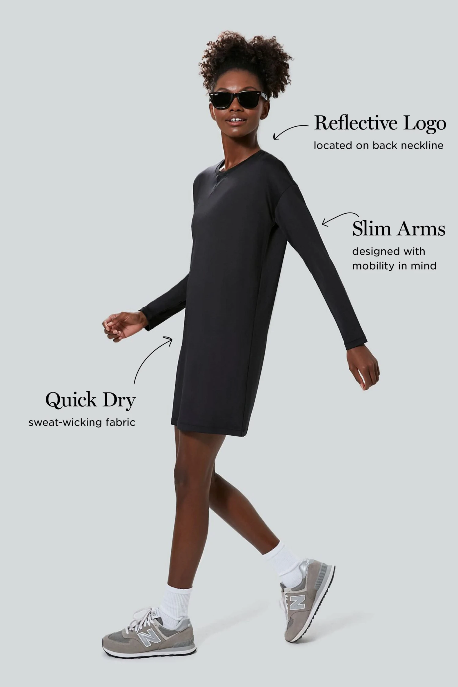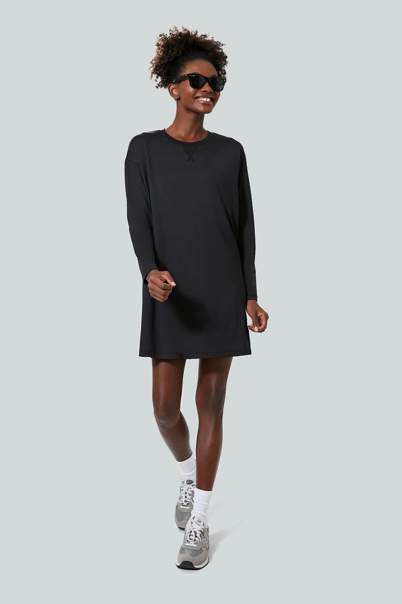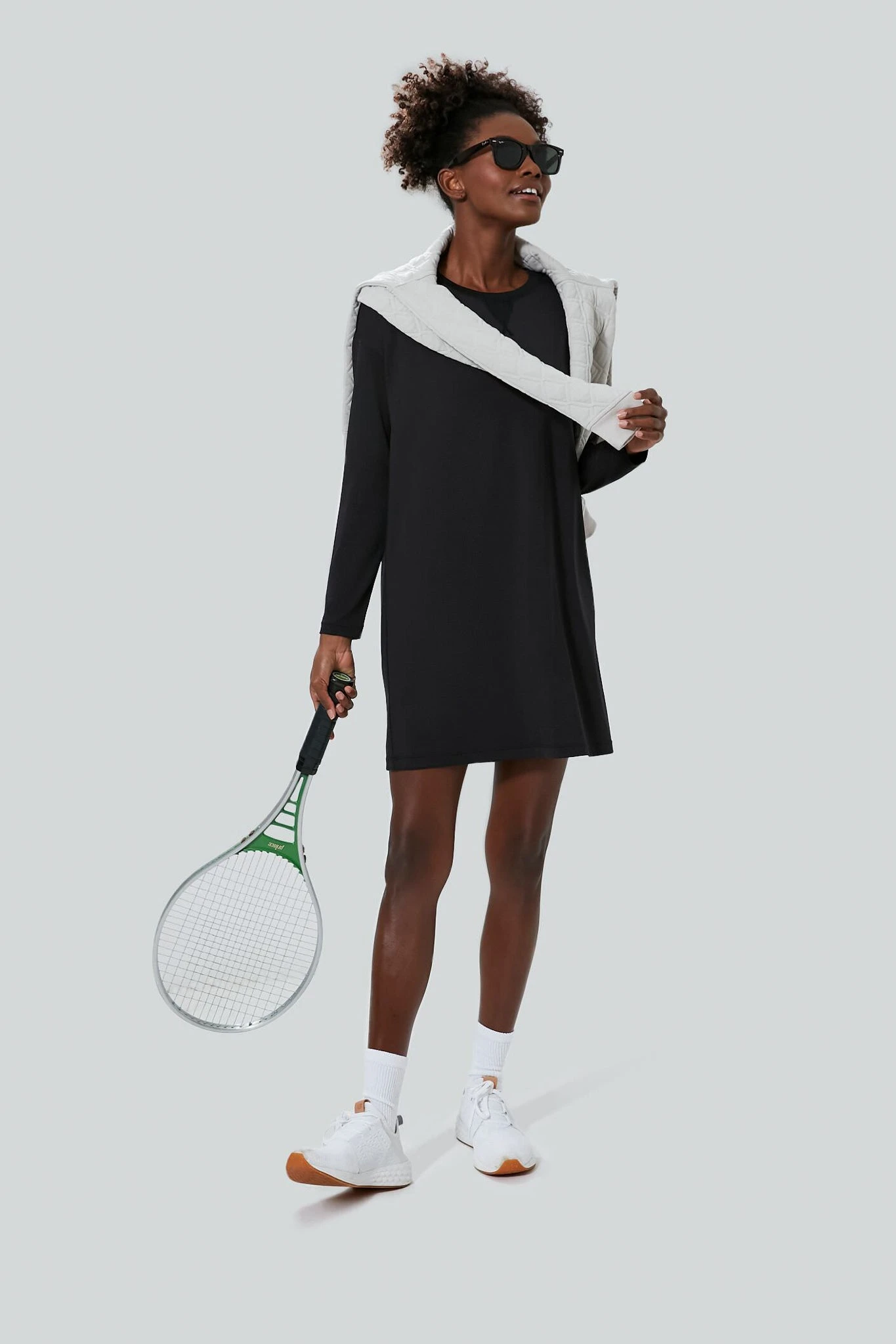 The Black Long Sleeve Corinne Sport Dress wears just as well on the courts as it does for carpool drop-off and daily errands. Constructed with fitted long sleeves so they stay out of your way and a roomy fit designed for mobility to keep you moving and grooving. This sleek, not too short mini is everything you need for those days when you’re on the go and need a no fuss outfit but want to stay looking your best.