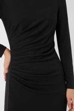 A classic beauty to add to your closet, the Black Nicole Dress is a perfect staple that you will come back to time and time again. The slim long sleeves allow for year-round wear, and the asymmetrical ruching at the side of the waist is ultra-flattering and effortlessly elevates your look. Pair this magificent maxi with heels and a clutch for a party, or style it with flats and some statement jewelry for a sophisticated ensemble.Â