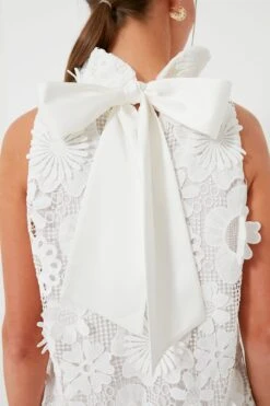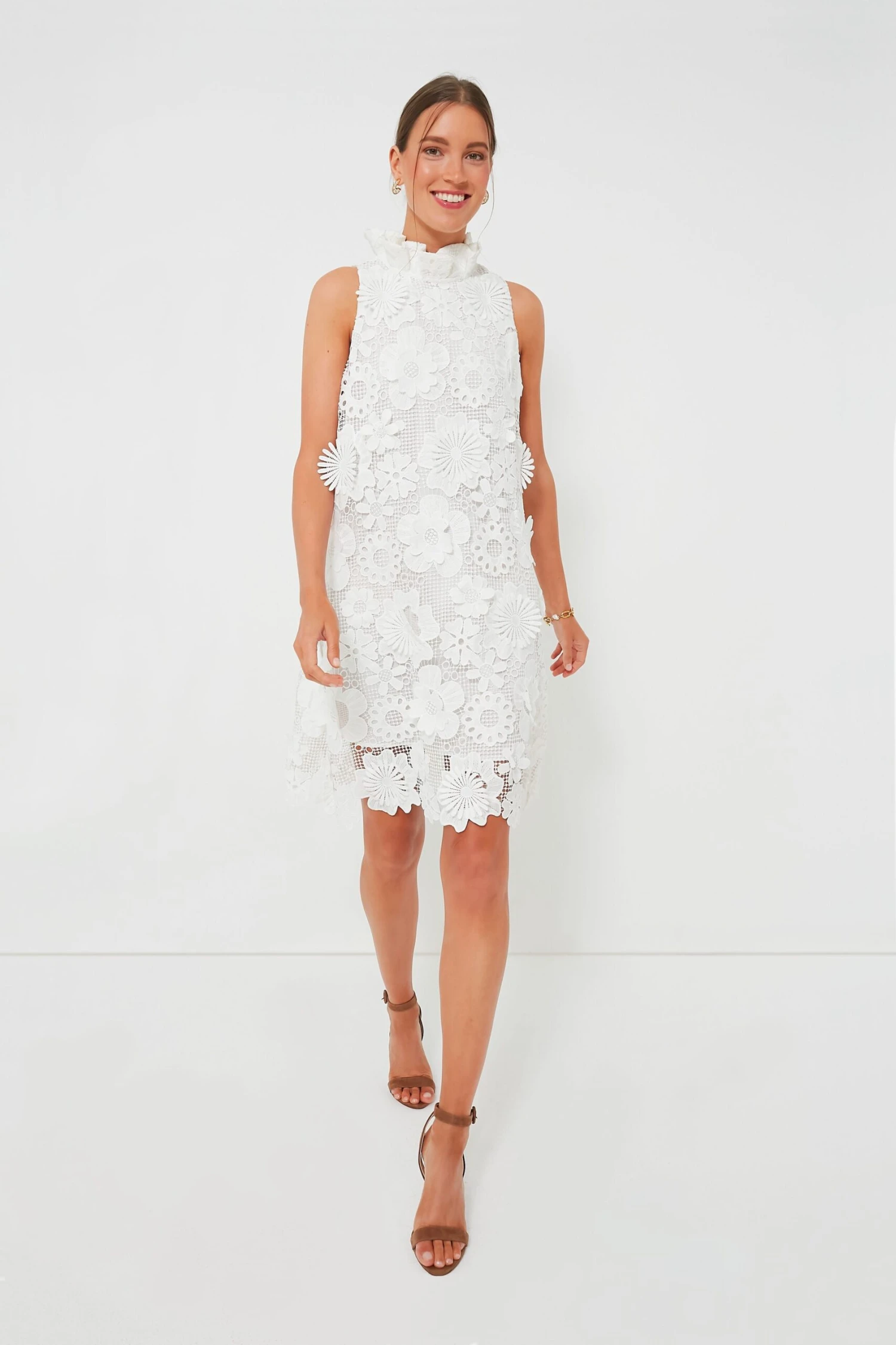 A Tuckernuck style staple, the Blythe is back and better than ever. Our design team spent months perfecting and testing our signature stand collar to get it just right. As Marvin Gaye once said: “Ain’t no collar high enough,” so bring on the ruffles and drama! Updated in a beautiful three dimensional lace fabric that’s perfect for the season, this swing shape mini dress reminds us of our favorite mod dresses from the 60s and 70s. Ready for al fresco dinners with family, cocktail parties with friends, and every social event on your calendar, the occasions are endless for this bow tie-back dress!