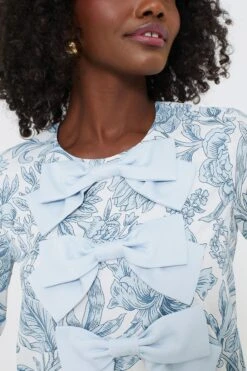 The Blue Chintz Clarice Bows Dress is a style fit for a princess. An elegant mini shift silhouette that boasts bracelet-length sleeves, three silky smooth bows on the front, and a graceful blue floral pattern. Pair with pearls and heels for a look that can be worn everywhere from weddings to baby showers to brunches!