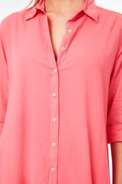 Meet your new favorite dress silhouette, the Glow Boden Dress! Made from crisp cotton poplin, this number features a fold-over collar, full length button front placket, and side slits for an elevated take on your typical warm weather dress. With a punchy coral pop, this easy number can be dressed up with platforms and beautiful jewelry or dressed down with a denim jacket and your favorite sneakers.