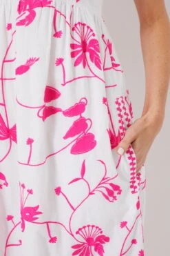 Talk about a bright pop of color! A Tuckernuck exclusive style, the Tropical Flower Pink Agate Dress is made from breezy and sustainable organic cotton embroidered with a stunning floral motif. This sleeveless midi has a relaxed and airy silhouette that is perfect for warm-weather adventures and all kinds of fun in the sun. Pair it with sandals and raffia accessories for a boho-chic look, or elevate it by styling with espadrilles and a clutch.