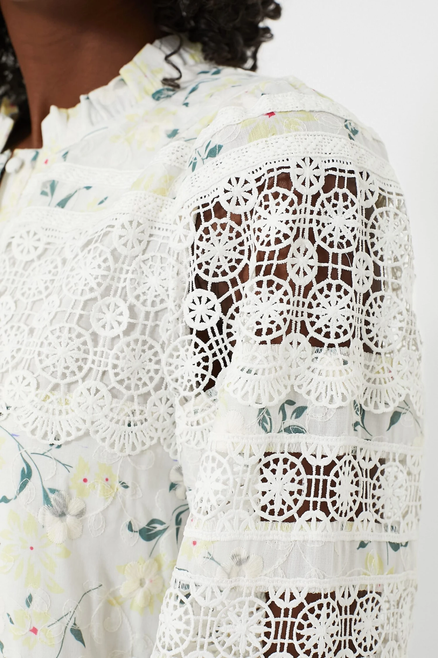 - Pintucking and lace insets throughout