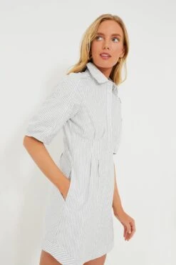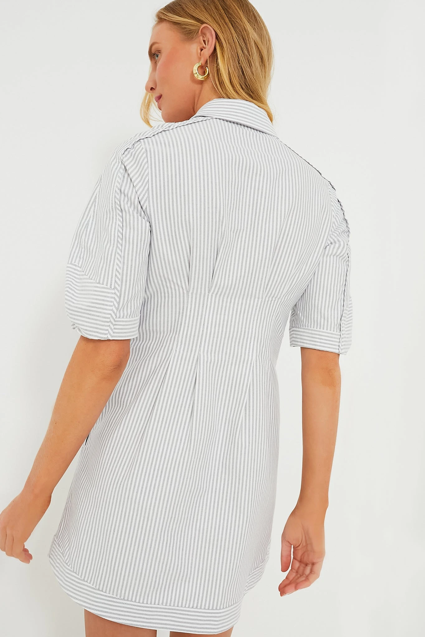 A simple silhouette with stunning details, the Midnight Stripe Percy Dress is a wardrobe classic. A crisp cotton fabric, timeless pinstriping, and a point collar all bring the sophistication while short puffed sleeves and a pleated waist create feminine flair. Easy to accessorize, there is no limit to where to wear or how to style this chic mini — a few of our favorites include with sandals for a picnic, with flats and sunnies for brunch, or with strappy heels and a clutch for an al fresco cocktail hour!