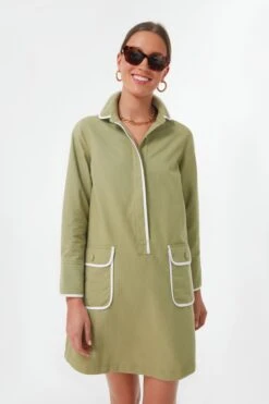 With subtle retro touches such as a white trim on a moss green backdrop and covered buttons for a classic feel, the Perkins Shirt Dress is the dress-up, dress-down number that we are wearing all season long. This mini is detailed with a spread color for a tailored touch and a covered front placket for added elegance– the bonus is the front patch pockets to keep you hands free. Pair with flats for the office, heels for date night, white sneakers for errands, strappy sandals for a chic vacation look– the possibilities are endless for this truly versatile number.Â
