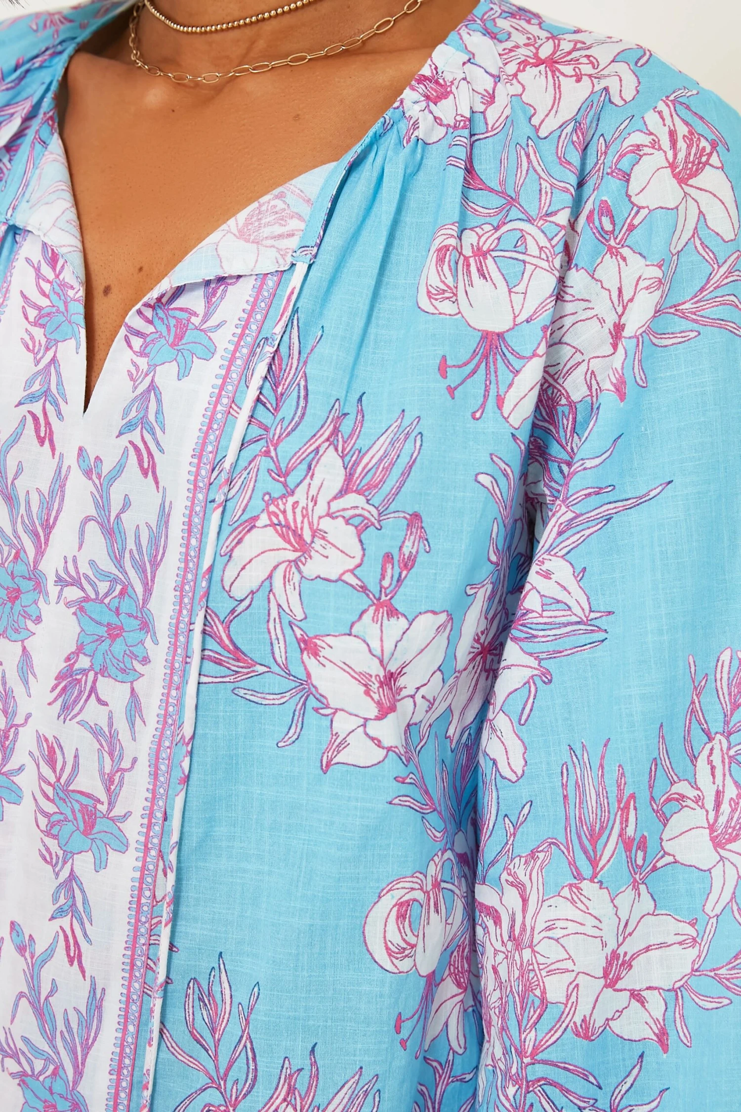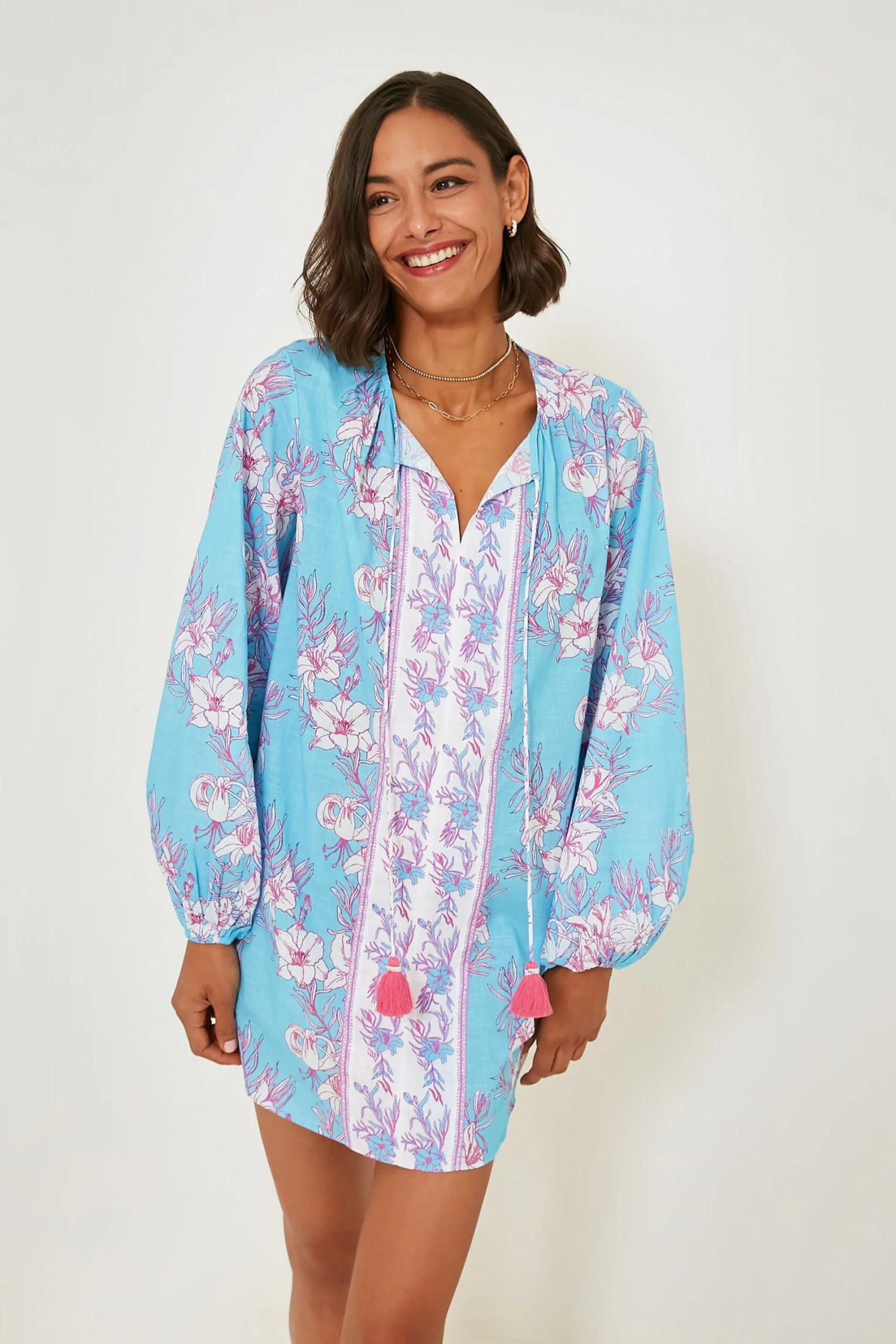There is nothing more effortlessly chic than a tunic-length caftan, and this turquoise and lavender hued dress does it oh-so-well. Subtle but stand-out details like a split neckline with tassel ties, long blouson sleeves, and a contrasting stripe down the front all add up to a silhouette you won’t be able to turn down. Made from lightweight cotton, this mini is perfect for throwing into your beach bag for days of fun in the sun, or for styling with sandals and gold jewelry for a casual lunch.