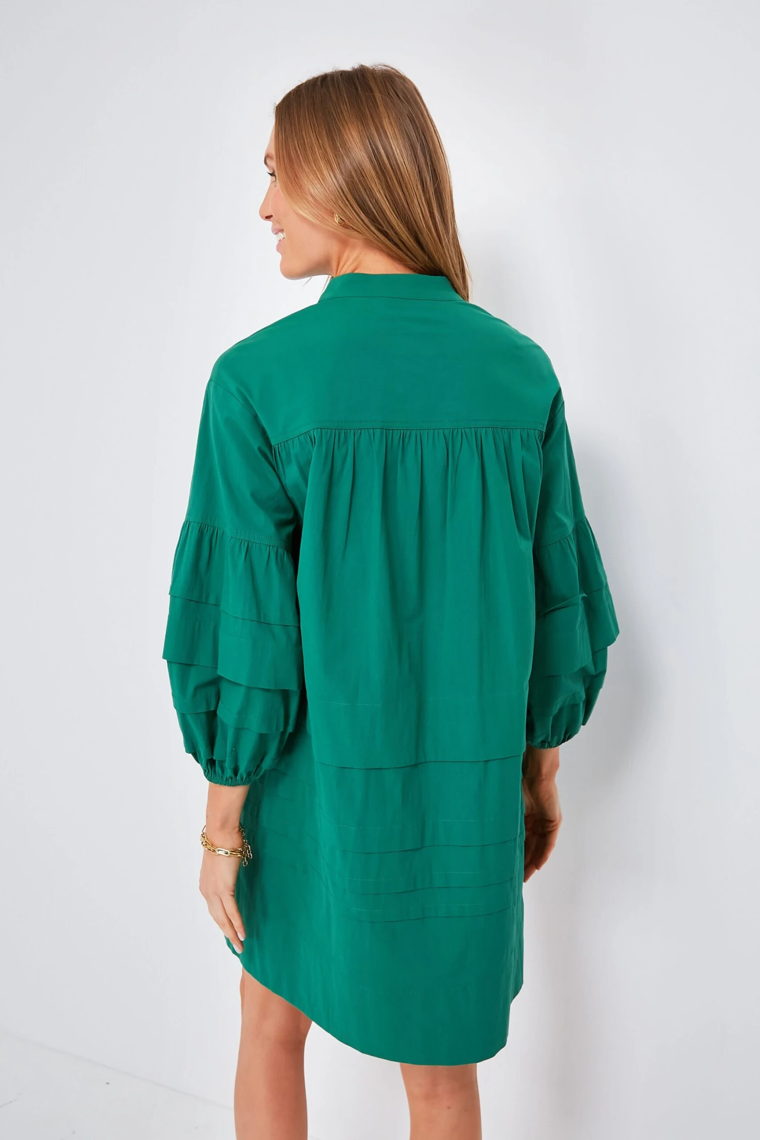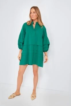 The Chelsea Dress is not to be overlooked. In a gorgeous palm green color, this mini combines darling and bold details for a chic, effortless day-to-night piece. A band collar and horizontal pleats throughout create an elevated, tailored feel that will take you from desk to drinks with ease. Dress it up with heels and gold accessories or keep is casual with sneakers and a denim jacket for running around town.