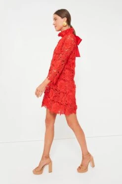 A Tuckernuck style staple, the Daphne is back and better than ever. Our design team spent months perfecting and testing our signature stand collar to get it just right. As Marvin Gaye once said: “Ain’t no collar high enough,” so bring on the ruffles and drama! Updated in a beautiful red guipure lace, this swing shape mini dress reminds us of our favorite mod dresses from the 60s and 70s. Ready for celebrations with family, festive parties with friends, and every social event on your calendar, the occasions are endless for this bow tie-back dress!