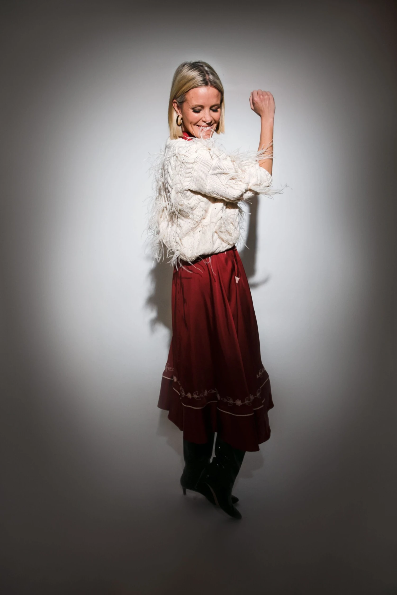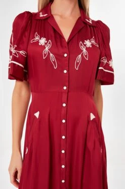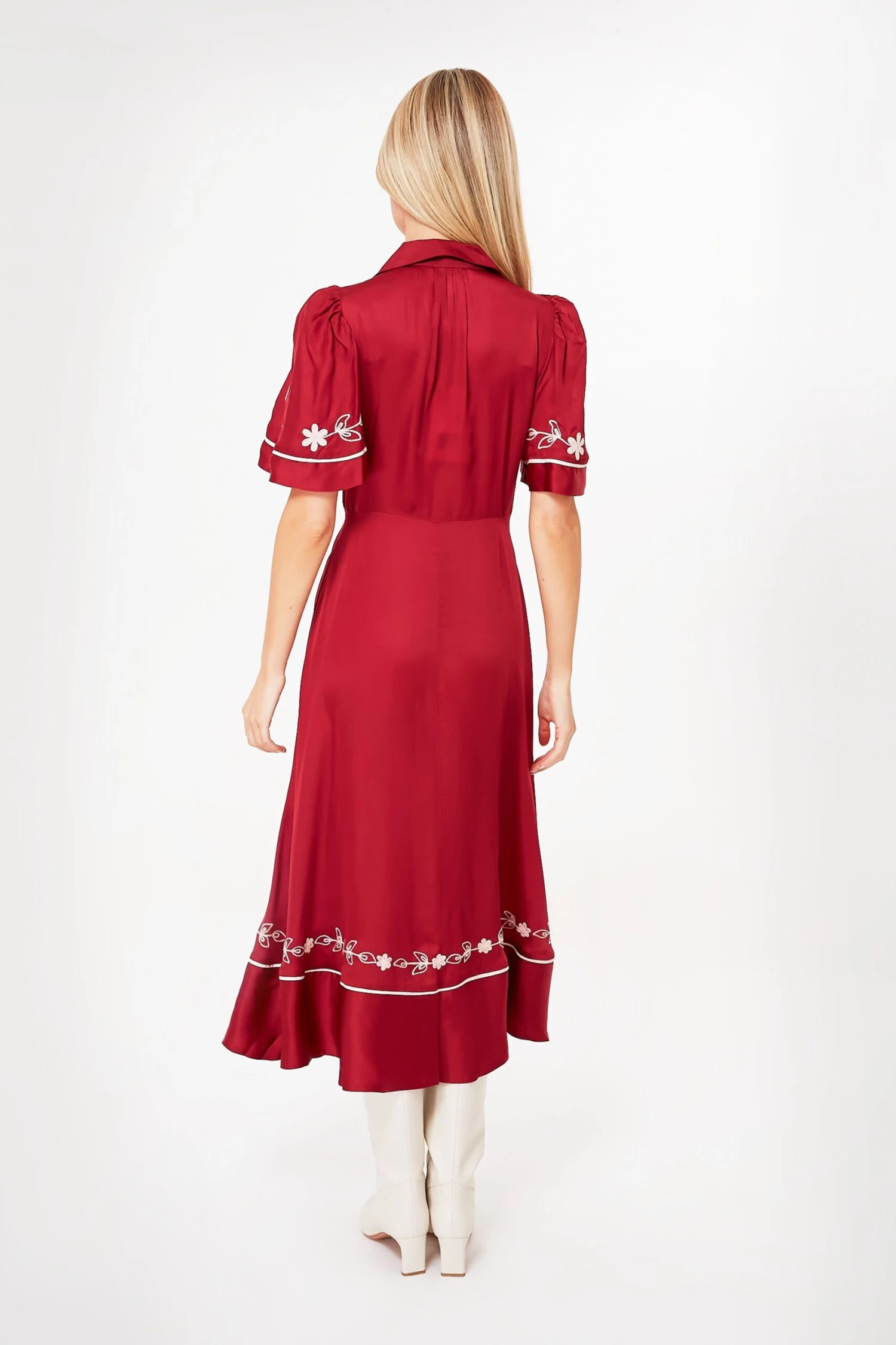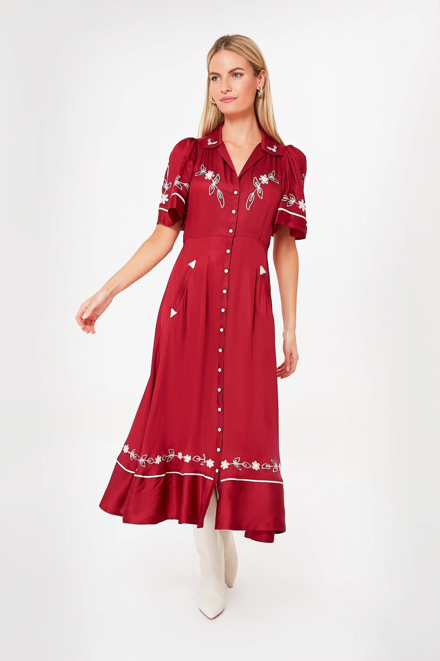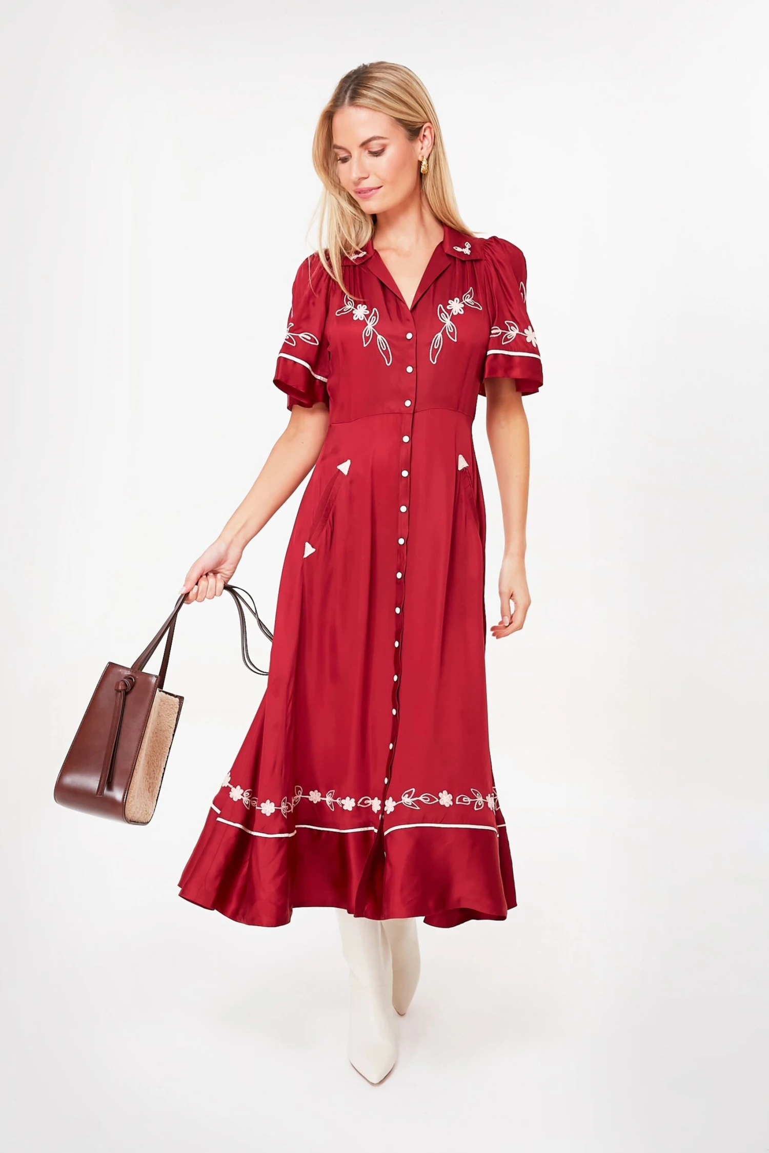 Inspired by 1940s western wear, the Rhubarb Bridge Dress is cut from a silky smooth viscose material and adorned with charming piping and embroidery. This thoughtfully designed midi has a notched spread collar, fluttery short sleeves, and pearl snaps that run down the length of the front, adding a feminine detail to this lovely silhouette with vintage vibes. We love this style dressed up or down with cowboy boots to lean into the look, or with subtle heels to bring a fresh new outlook.