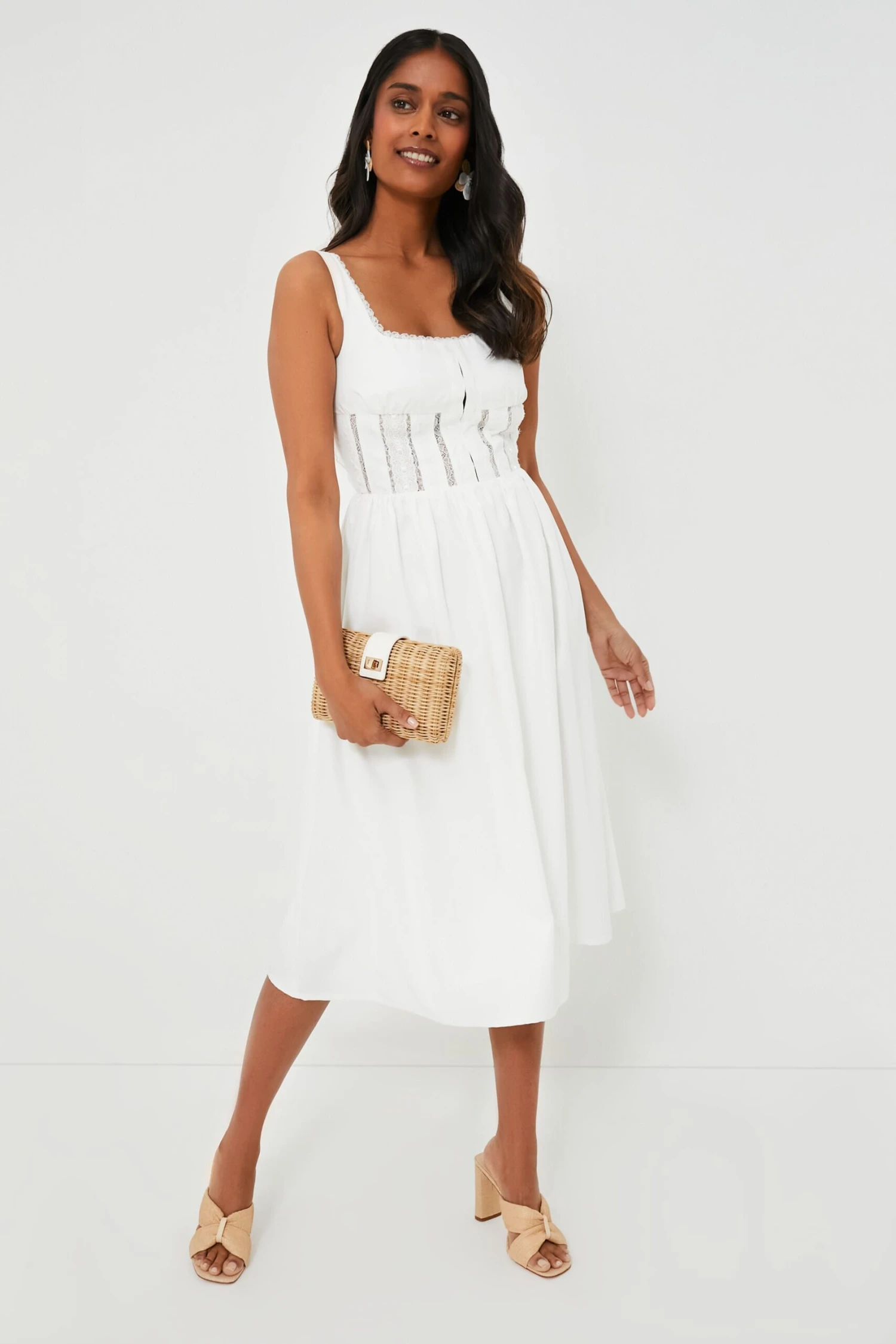 The White Giada Dress is a an effortless style that is feminine and flattering. Featuring a sleeveless fitted bodice with lace inserts, and a full skirt, this midi is stunning however you style it. We love styling it with a neutral tone bag, matching heels and statement earrings for an easy-breezy look.